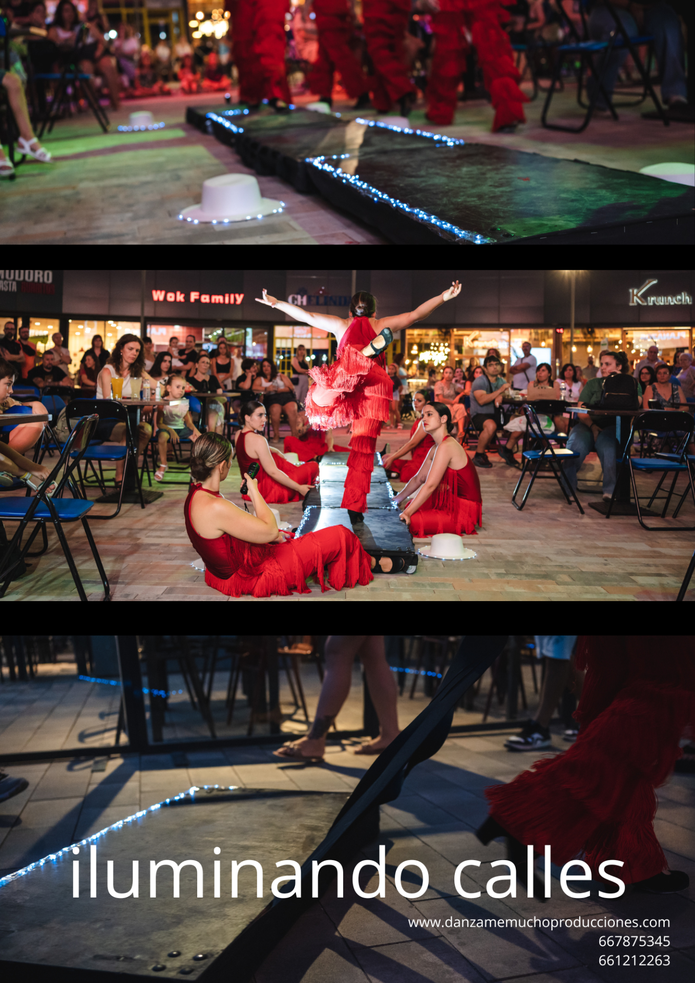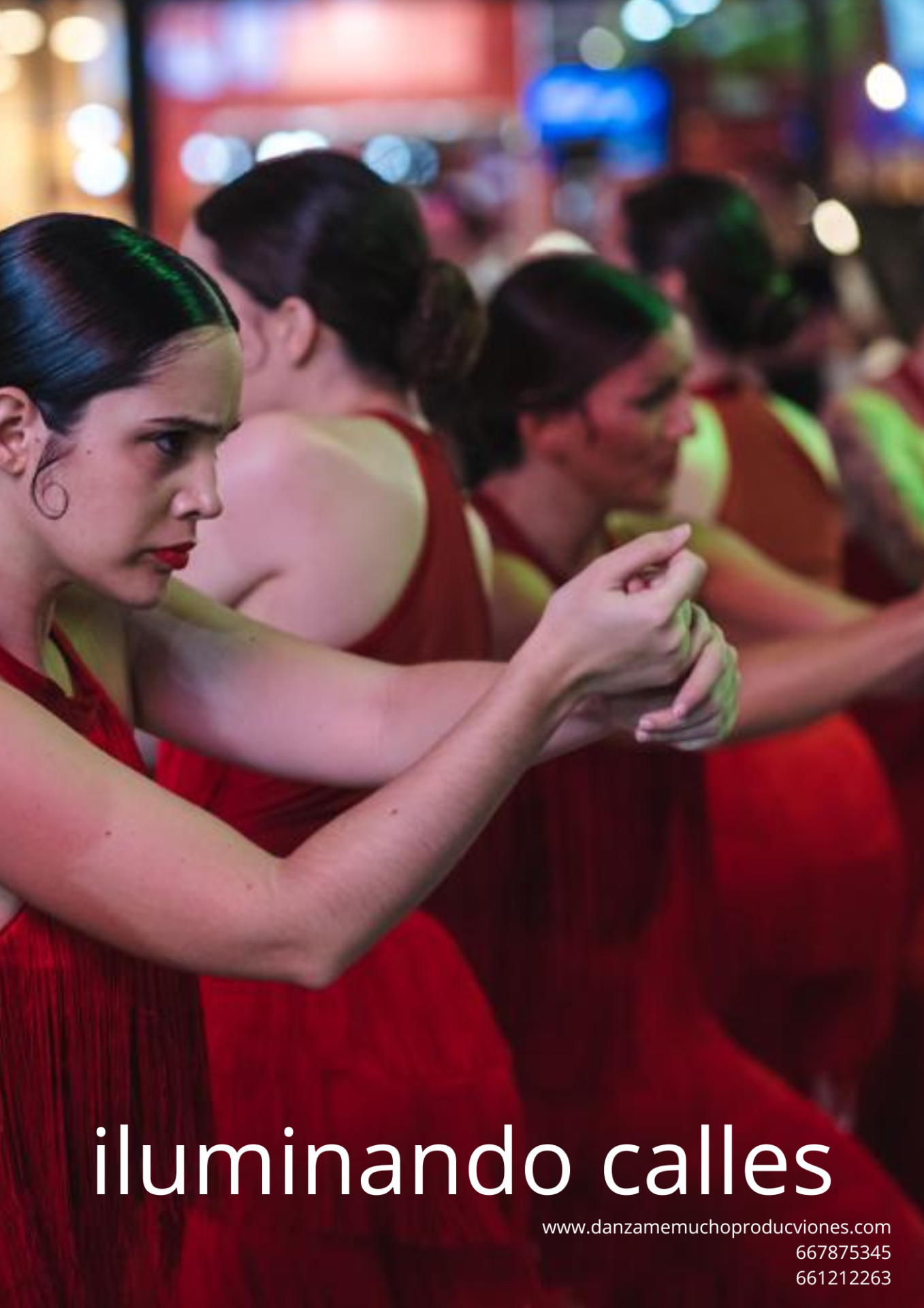 Espectáculo de danza, concebido para calle con música tradicional y electrónica con efecto visual muy impactante. 6 intérpretes componen y descomponen este espectáculo, con plataformas y sombreros luminosos, castañuelas luminosas, sonidos vanguardistas y danza impactante. Salen de lo convencional, unidas a la tradición. 30 minutos de performance de danza x danza, de flamenco de vanguardia, de modernización y energía a nuestro legado.
